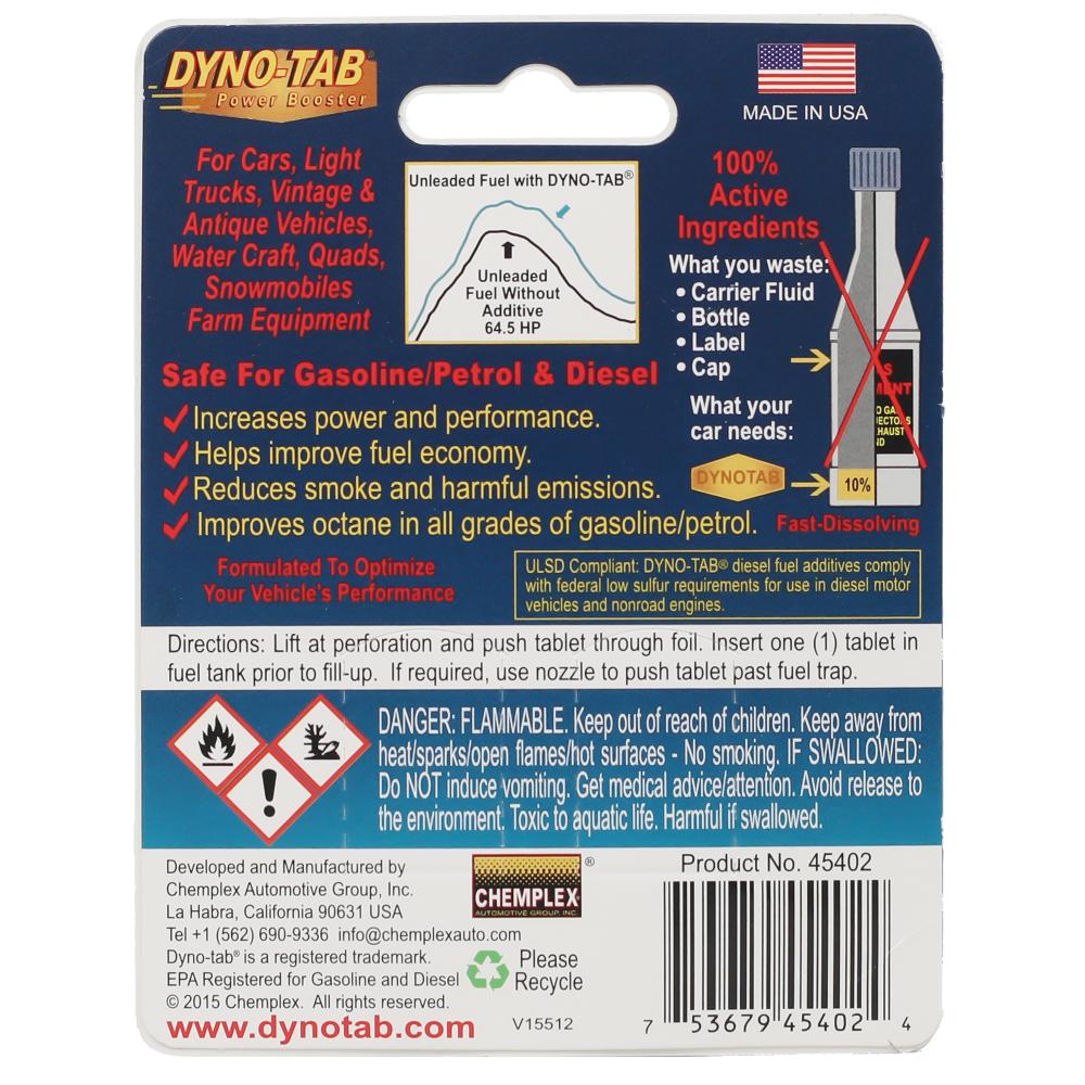 DYNO TAB Fuel Treatment – for GASOLINE & DIESEL Engines, Improve Fuel Economy, Reduce Knocking & Improve Acceleration, 2 Tablet Card, 1 Tablet Treats 60L – 45402