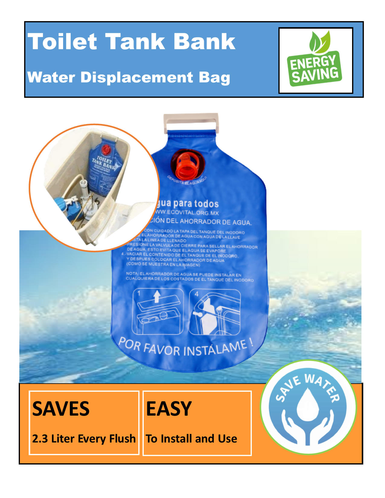 The Toilet Tank Bank is a globally trusted water-saving solution, designed for efficiency, affordability, and ease of use. Simply fill it with water, hang it inside your toilet tank, and enjoy instant savings — no maintenance required.